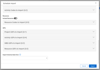 In addition to manual entry and cost item imports, you can also update schedule values by importing an XER file.