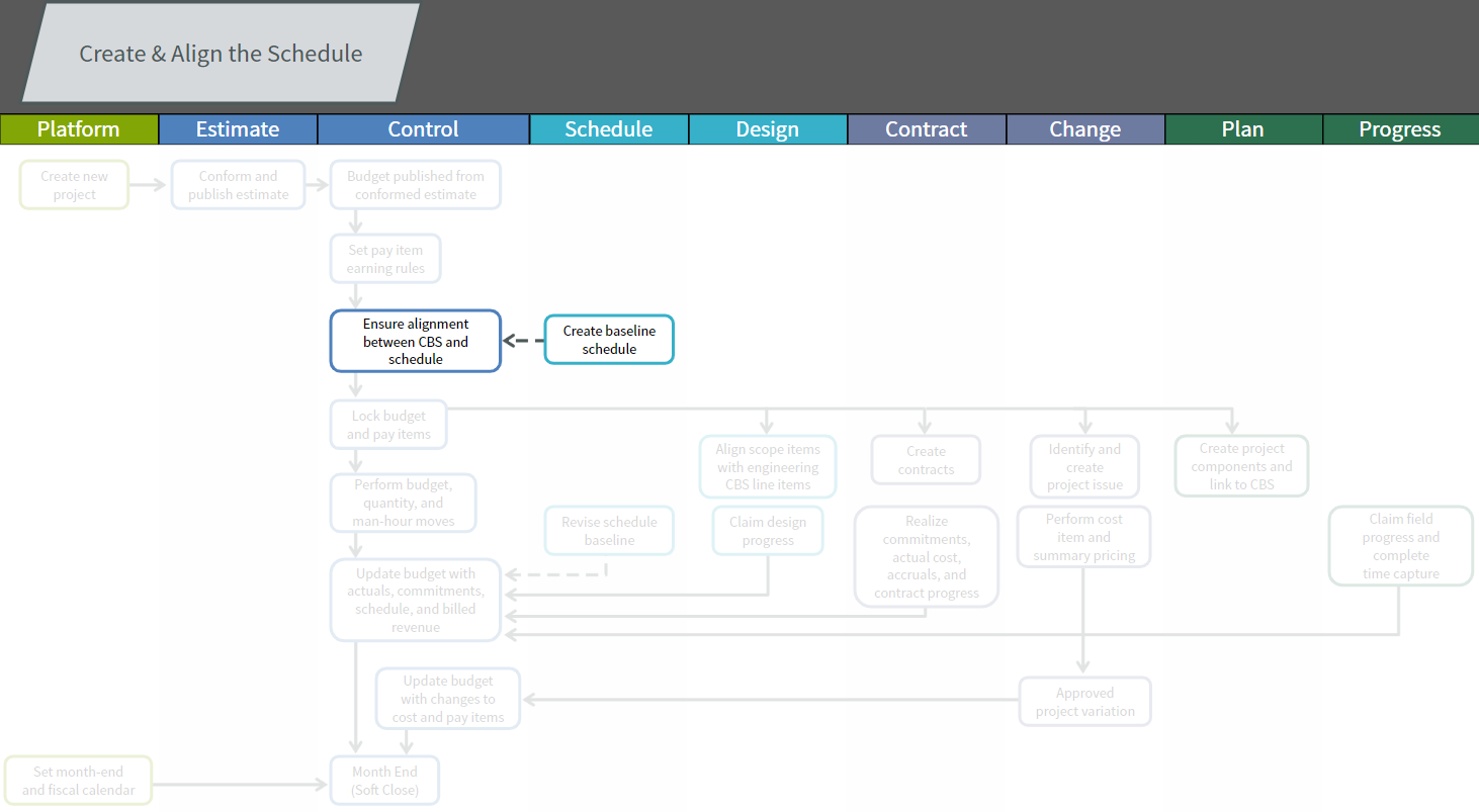 With the conformed estimate published in Control and a baseline schedule prepared, the project controller and project scheduler can take steps to ensure that the budget cost items and schedule activities are aligned.