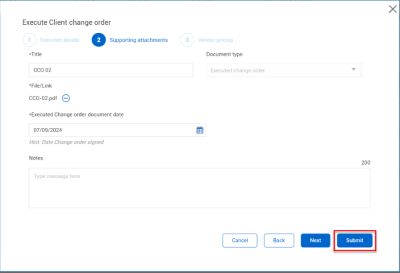 He attaches the signed executed change order. This change order is not associated with a vendor, so he doesn’t need to input details under Vendor pricing.