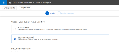 In the Budget move – Details step, she selects Non-Associated. This initiates a non-associated budget move workflow.