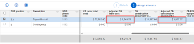 Note that the adjusted CB cost is automatically calculated for the Topsoil Install cost item based on the values she added for labor and equipment.