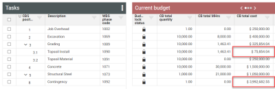 The project controller receives an update that the labor costs for the Grading team have increased. She applies a portion of the contingency budget to several Grading cost items to account for the change.