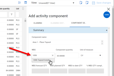 Input the component details, including a WBS code to link this component to a cost item in Control.