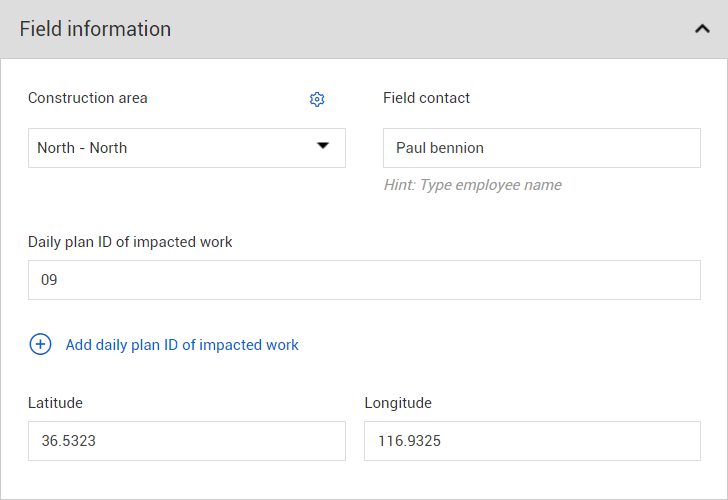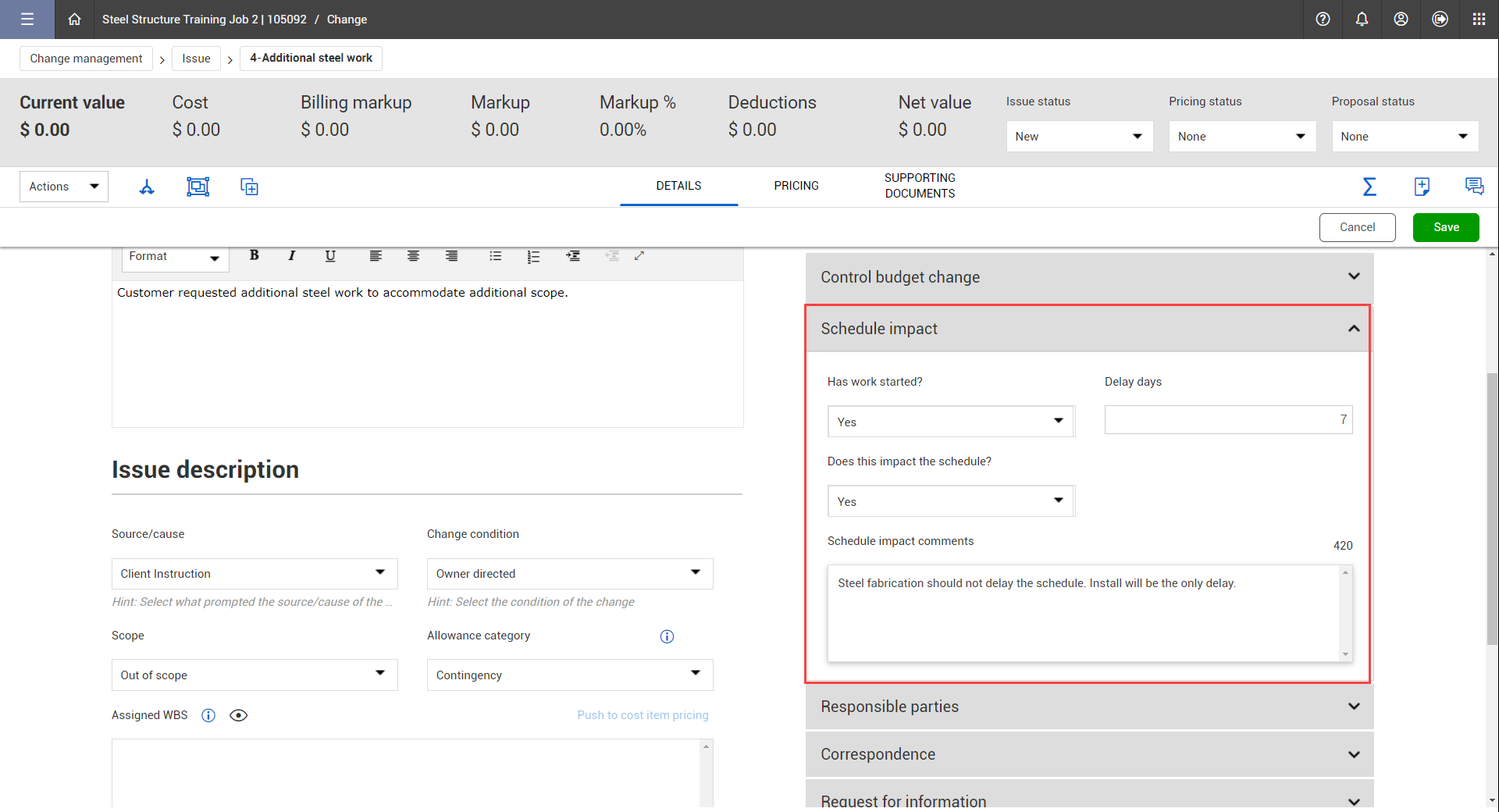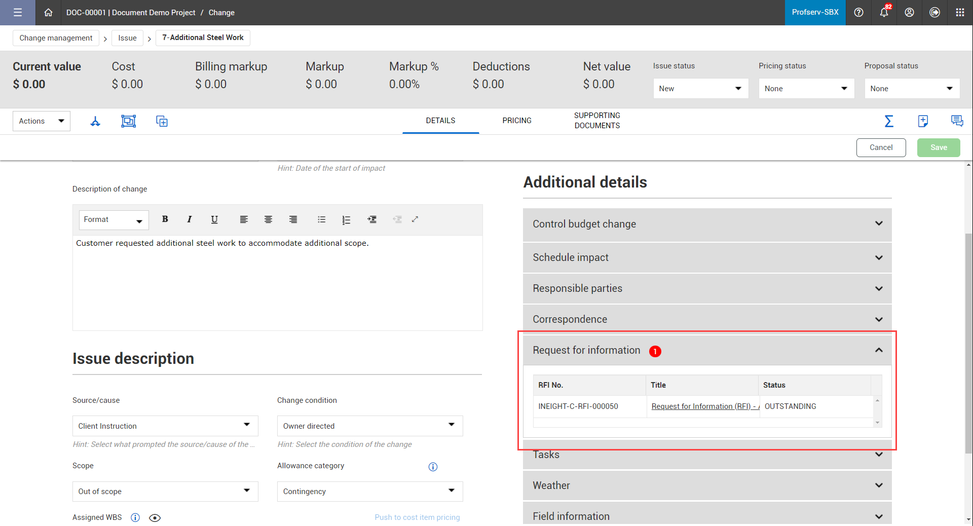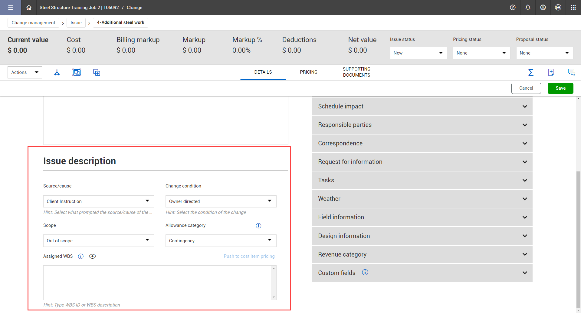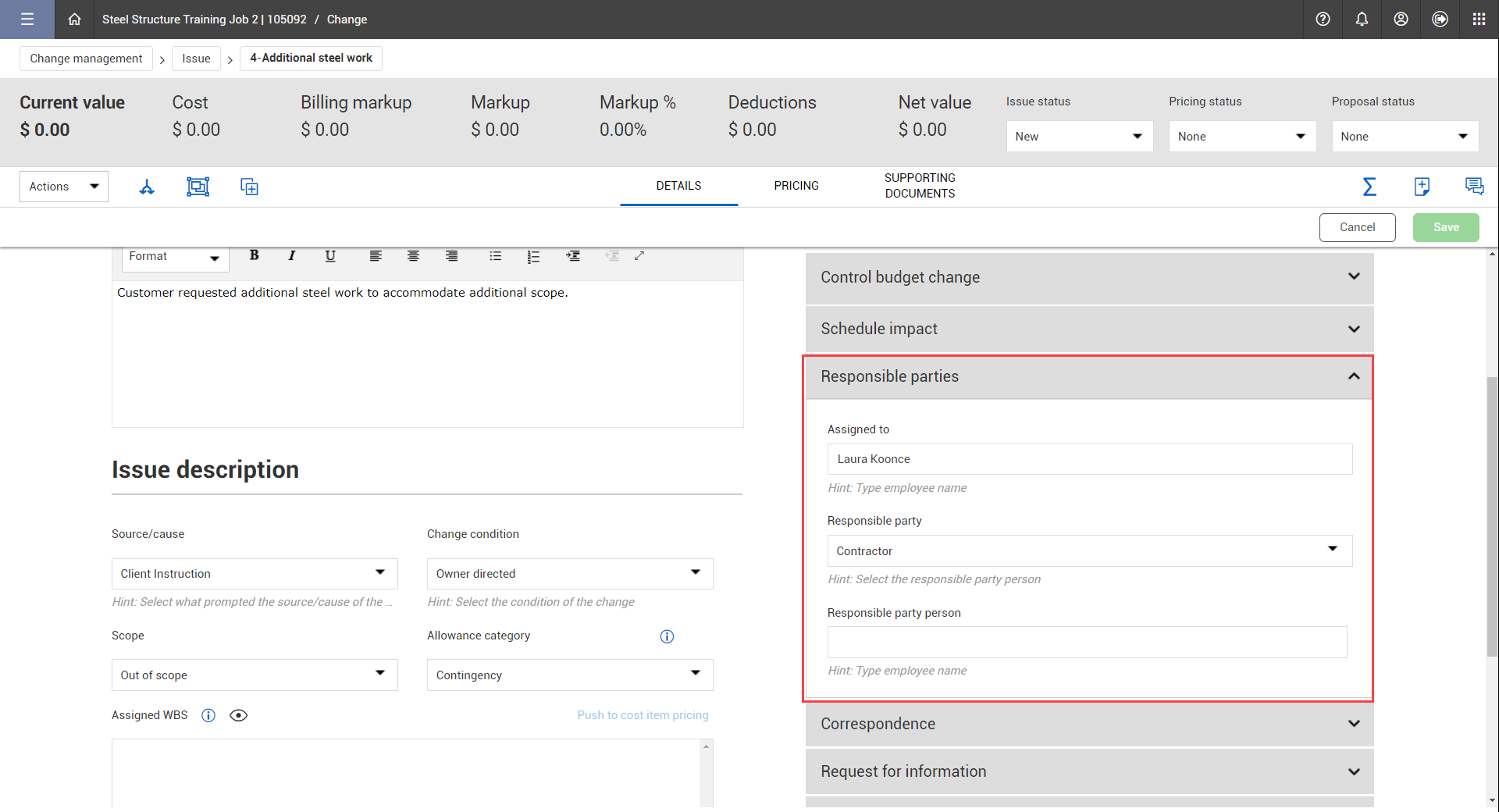 The issue record within InEight Change includes numerous fields to capture the scope and requirements of the issue.