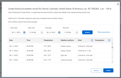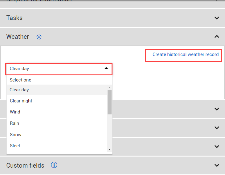 Select one or more weather conditions. Additionally, when using the “Create historical weather record” function, there is a prerequisite of using the longitude and latitude within your project details for the project site. If created, a PDF document is saved in Supporting Documents.