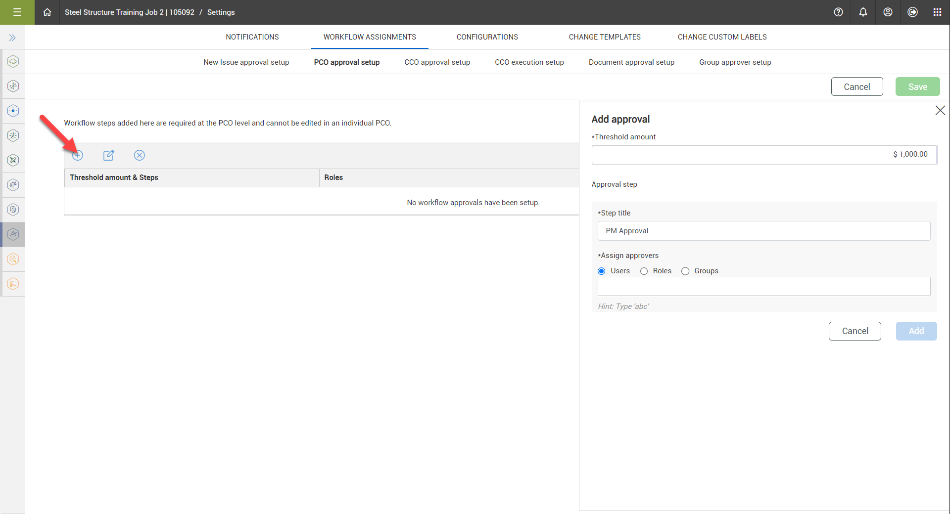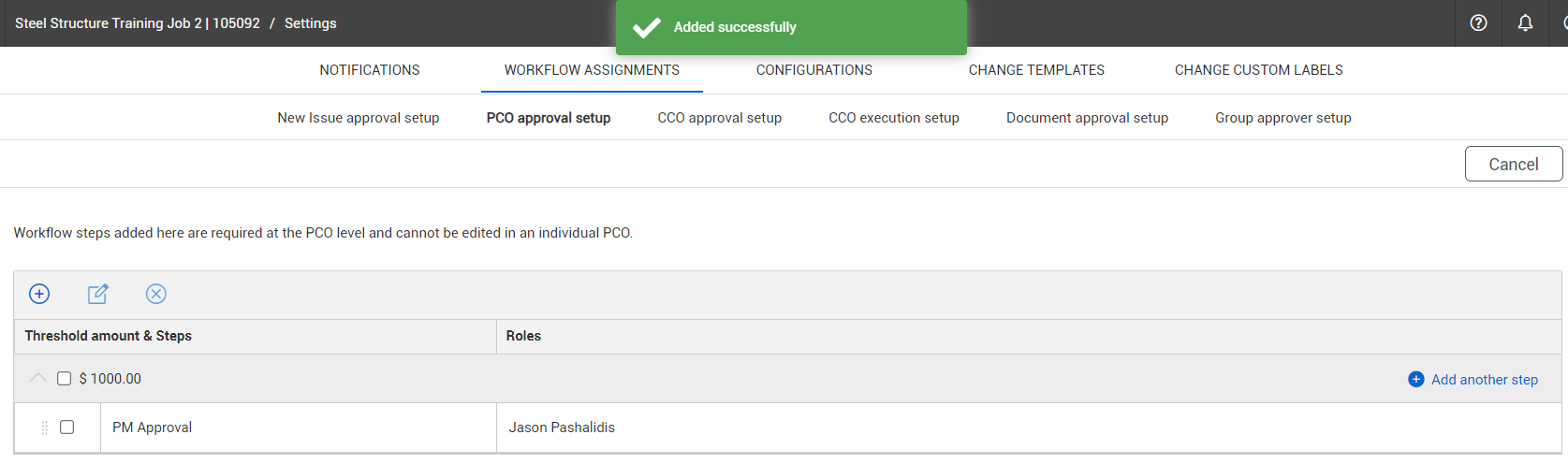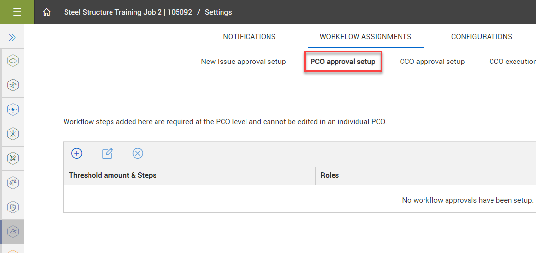 Workflow Assignments are made at the project level. They allow you to specify approval steps and the users/roles responsible to approve. When a new PCO is created, the appropriate employee is notified via email to review and approve or reject the PCO.