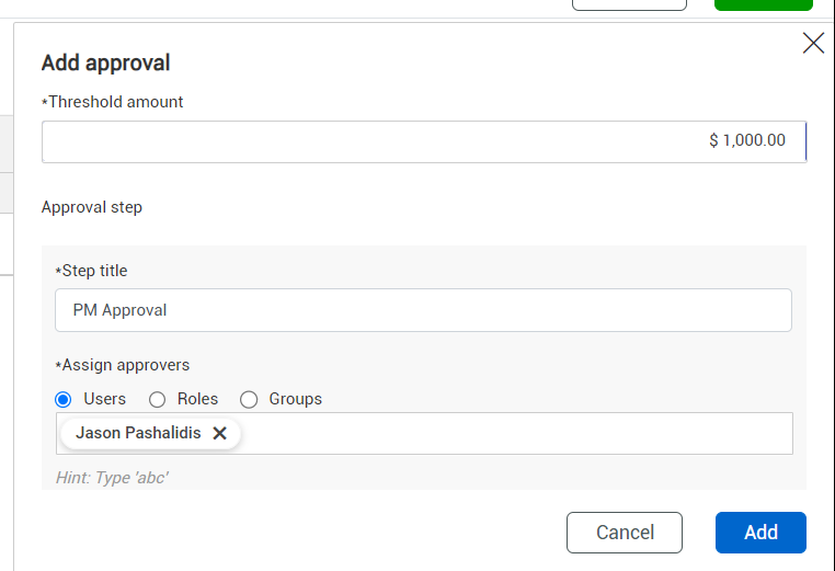 Provide a step title with a threshold amount. This is the amount that will trigger the approval step.