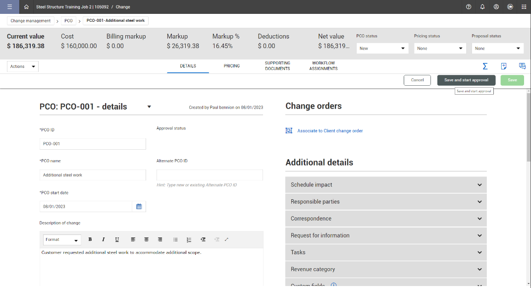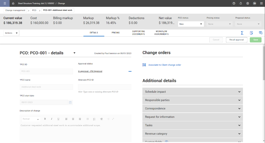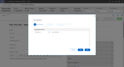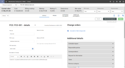 Some organizations may include an approval workflow at the PCO stage, before converting them to client change orders (CCOs). Approval workflows for PCOs are set up under Project Settings. You can then launch the approval process from the PCO record’s Details tab.