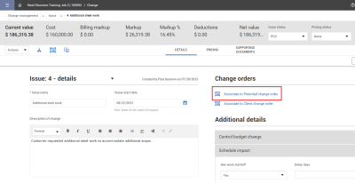 Within InEight Change, you can associate the issue record to a new Potential Change Order (PCO) record.