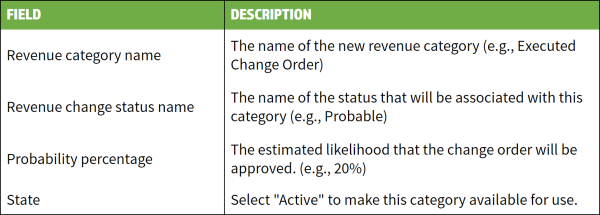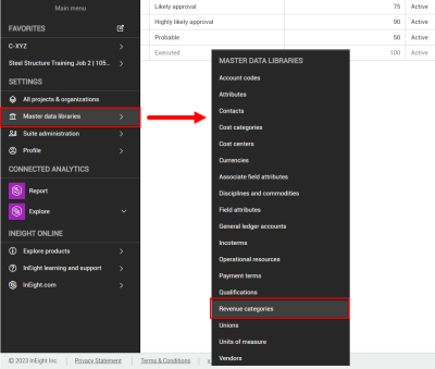Revenue categories and probability percentages are customizable in your organization’s Master data libraries.