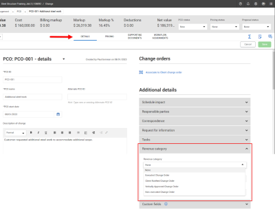 To assign a revenue category to a PCO, go to the Details tab of the PCO record. Under Additional details, expand the Revenue category. Select appropriate category from the drop-down menu.
