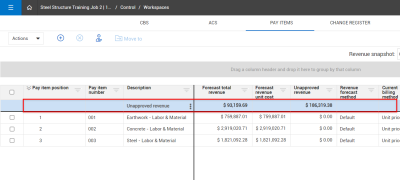 To review forecasted revenue in Control, go to Control > Workspaces > Pay Items. From here, locate the unapproved revenue line item. This is the total of all unapproved revenue that is not yet allocated to existing pay items.
