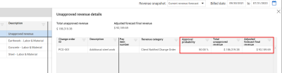Right click in the Unapproved revenue row and select Pay item details to review the unapproved change orders contributing to this amount.