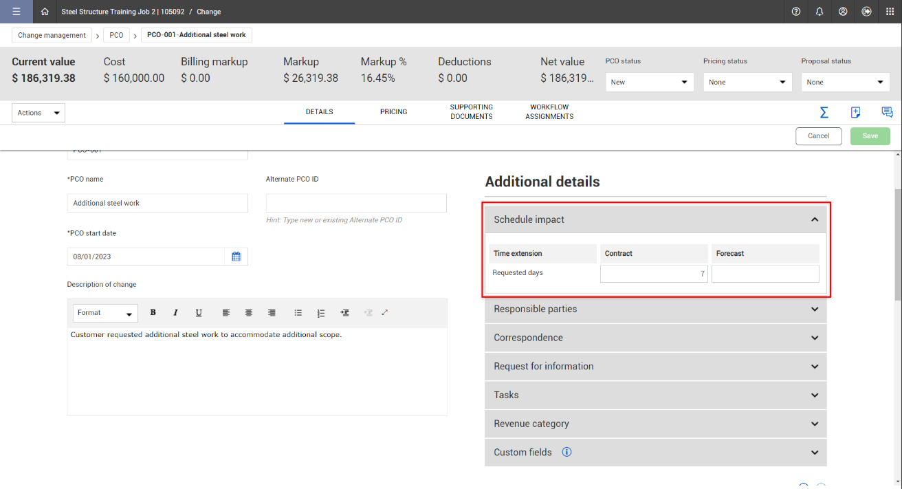 To update delay days, go to Schedule impact under Additional details on the Details tab of the PCO.