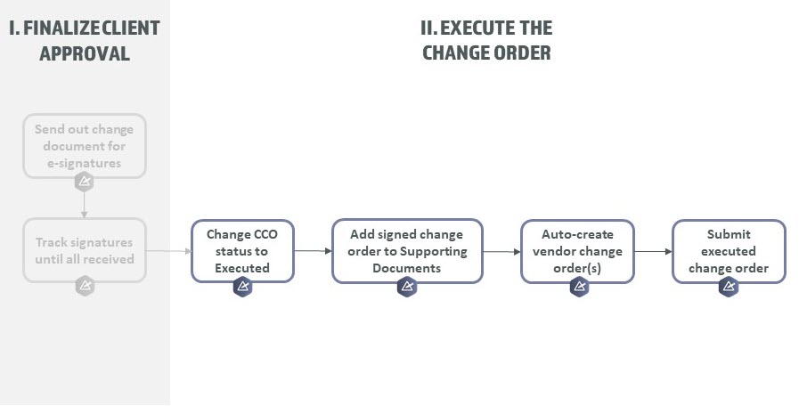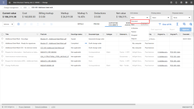 Within InEight Change, changing a CCO to the Executed status triggers a a few steps to finalize the CCO. These steps include adding the final signed agreement, creating VCOs (if necessary), then clicking Submit.