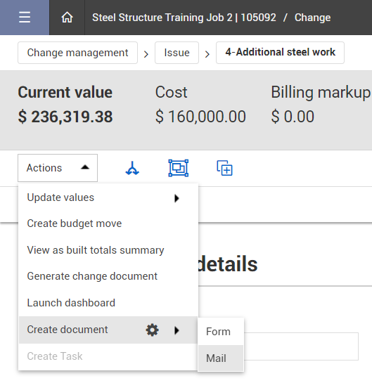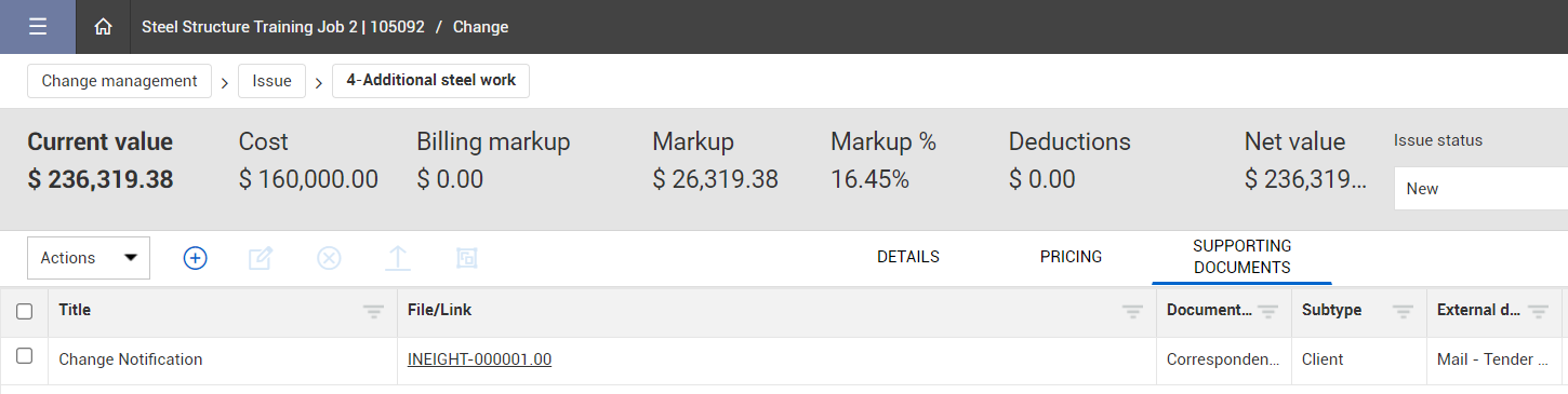The following steps walk you through sending an Document mail to stakeholders directly from the issue record in InEight Change. By generating your email within InEight Change, the system will keep an audit trail of all correspondence, which you can review from the issue’s Supporting Documents tab.