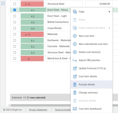 To review actuals details for a cost item, right click on the cost item and select Actuals details.