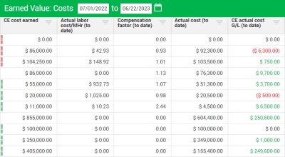 Use Case: The project controls manager compares actual costs to earned budget values to determine areas of the project that need extra attention. She runs a report to share with the Project Manager and review in the next team meeting.
