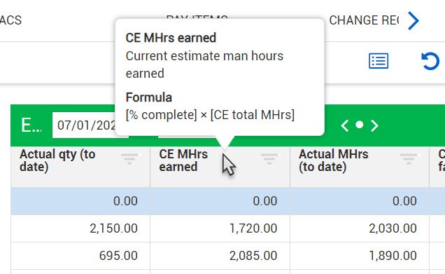 Each column in your data block will display a specific data point (such as actual quantity to date) or a formula. To view the formula for a column, hover your cursor over the column header.