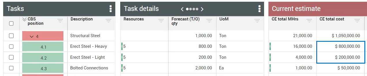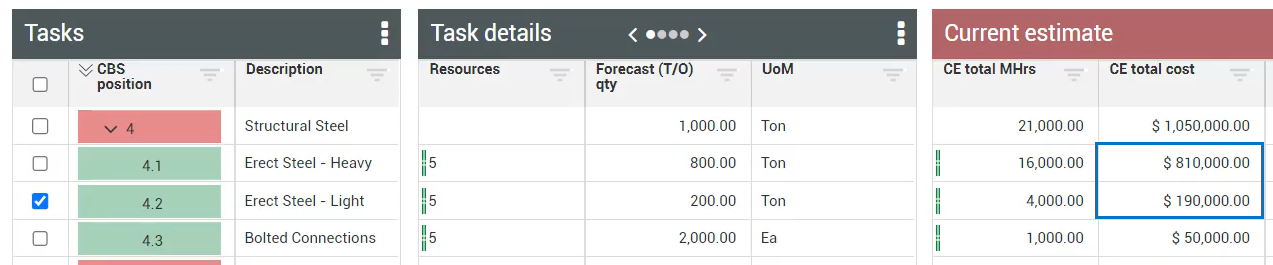 Due to recent changes, costs need to be moved from the Erect Steel - Heavy cost item to Erect Steel - Light. After changing the CE total cost values, the current estimate for Erect Steel – Heavy and Light look like this: