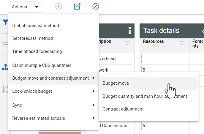 You can use the Budget quantity and man hour adjustment option to move quantities and man-hours.