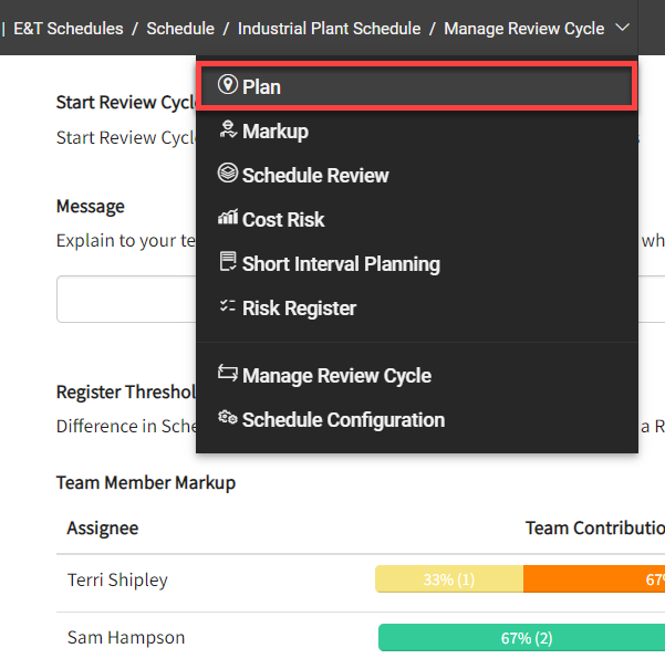 After launching the review cycle, the scheduler received submitted progress updates from his field employees in the Markup view. The scheduler reviews the updates and applies them to the schedule.