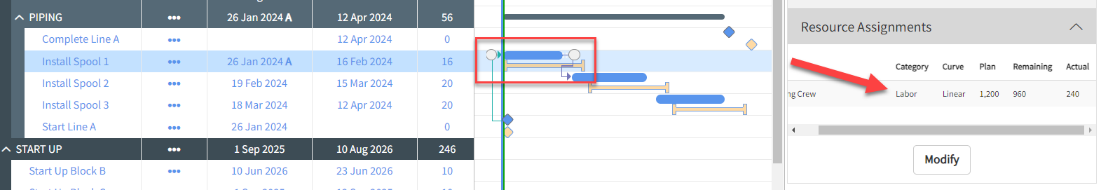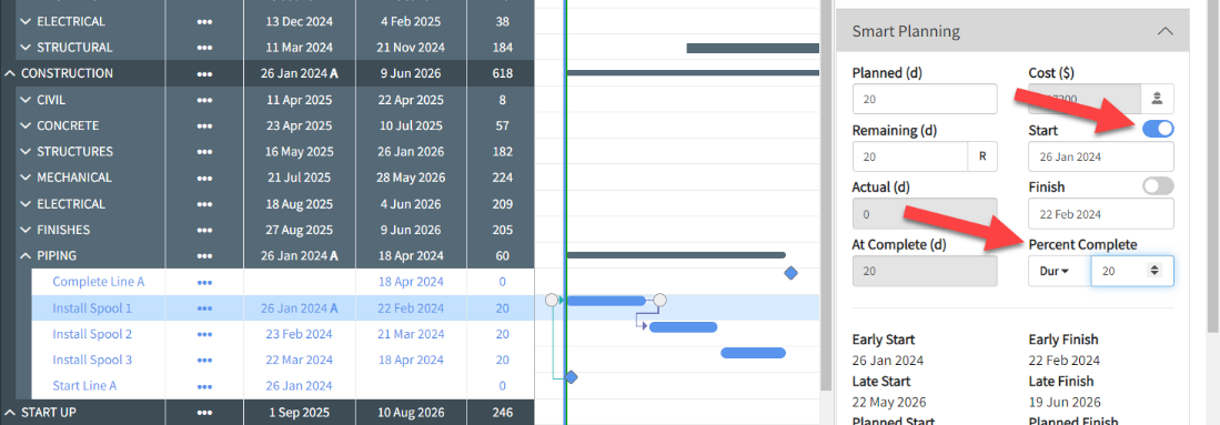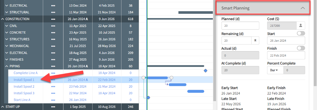 You begin with updates to the Piping work. You select the activity Install Spool 1 and open Smart Planning in the Iris panel.