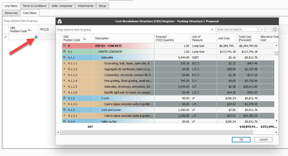 On the Line Items > Cost Items tab open the CBS register, select the cost items to include on the RFQ, then click OK.