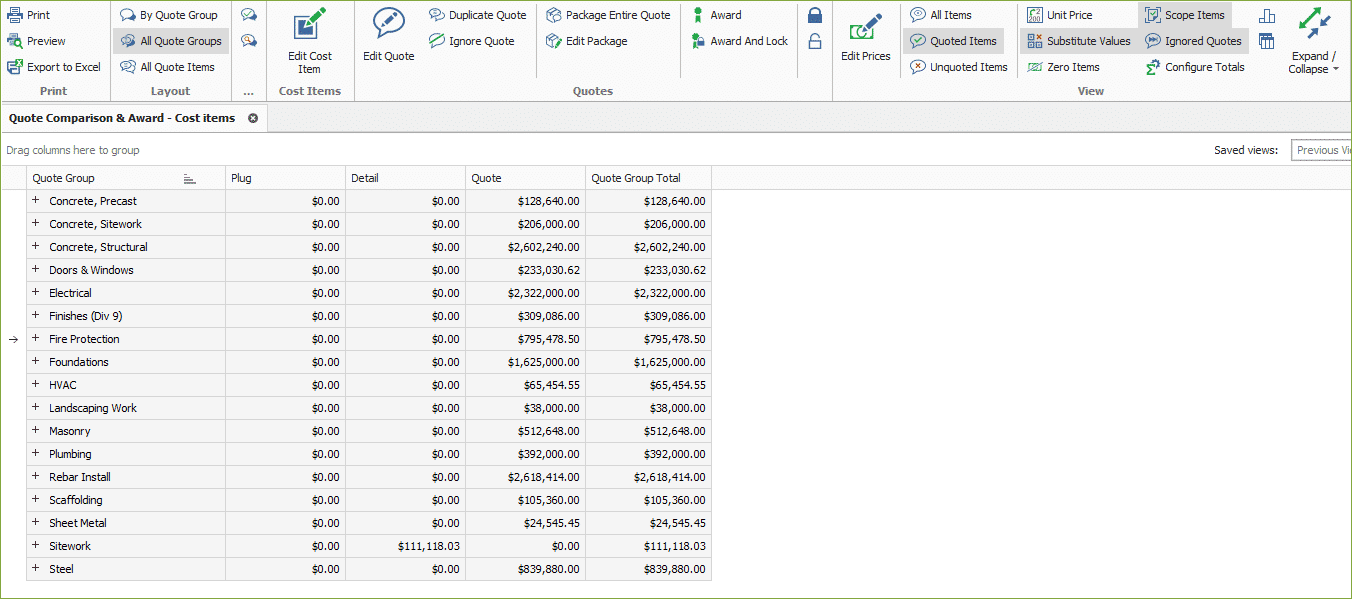 When subcontracting a lot of work, it can be difficult to see if you have good scope coverage across all the work in your estimate. Within InEight Estimate, using the Quote Comparison & Award register on the All Quote Groups view, you can easily scan the entire estimate for all quote groups to ensure scope coverage as shown below: